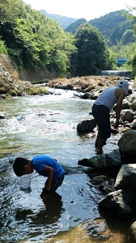 ●7月某日: 義実家にて起床。サク、朝食をいただいたら川遊びする気まんまん。家の裏から降りて行ったところが川になっている(夫や義父曰く、昔に比べるとだいぶ水位が減ったらしい)。で、サクはというと泳ぐとか水遊びというより魚捕りに夢中。 いや、夢…