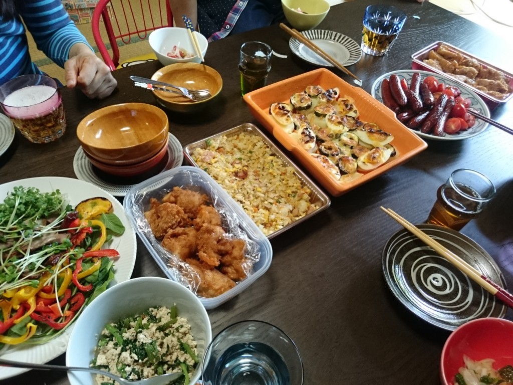 ●5月某日: 夫と交代で台所に立って食べ物を用意し、友だちの家で持ち寄りごはん会。うちからは唐揚げにチャーハン、春菊の白和え、新玉ねぎとトマトのマリネ、いちご。友だちの家では自家製の燻製の数々がメイン!!! 毎度おいしいですありがとうございます! じゃがいもとナスのチーズ焼きみたいなのもおいしかった。そして米粉パン! ビールやワインも持ち寄って、よく喋り、けっこう飲む。