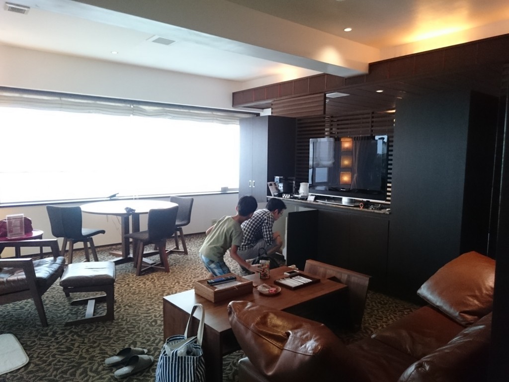 さっそくひとっ風呂浴びて、ホテルの中を散歩したりもして(1Fにいい感じのライブラリーがあって、そこで新聞読んだり)、今日の夕食はホテルの鉄板焼きのお店。カウンターに並んでコースをいただく。焼き物は目の前でシェフがやってくれる。牛肉はもちろんだけど、イカと何かの貝もめっちゃ美味しかった・・・。さつまいもの冷製スープもびっくりするほど美味しかった・・・。部屋に戻って、2次会。サクは8時を過ぎると「もうねようぜ」と言う。疲れてたんだね。